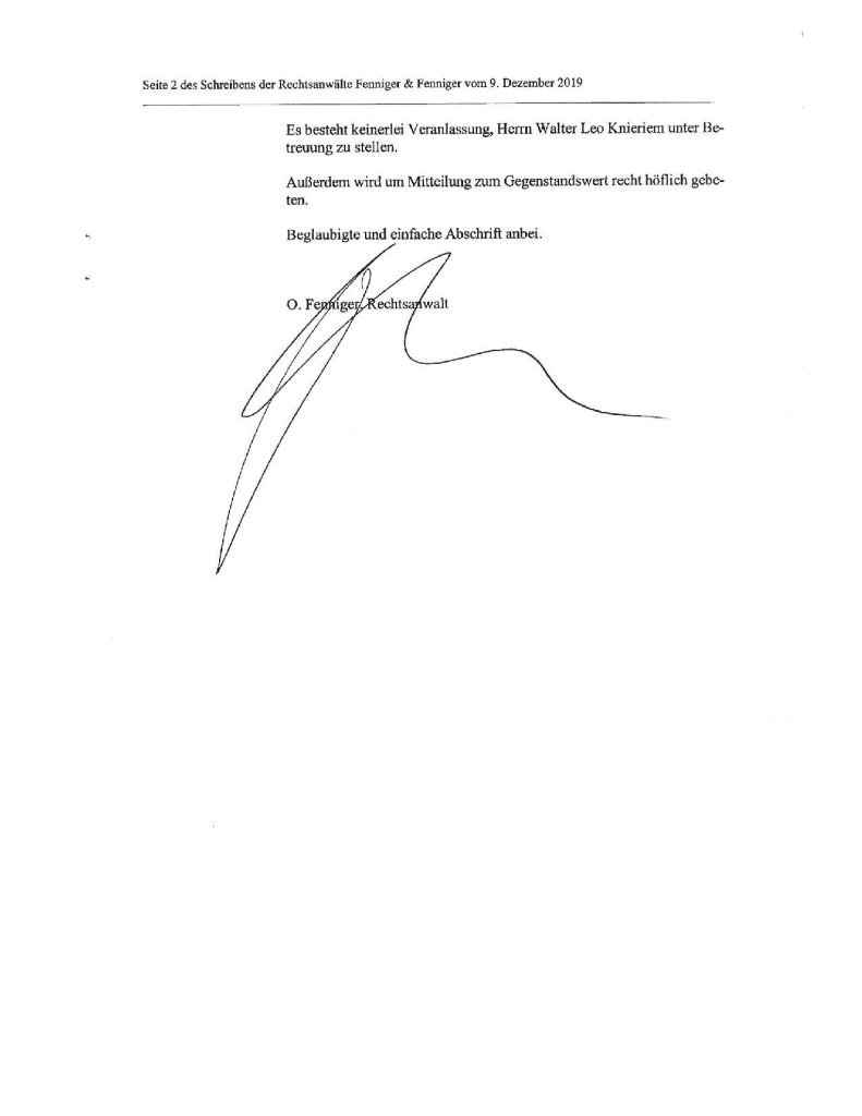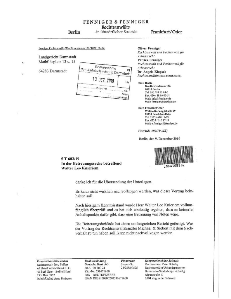 Am 09. December 2019 oder besser 4 Wochen nachdem man Walter Knieriem 300.000 EUR raubte, erklaerte OLIVER FENNIGER vor Gericht wie GESUND!!! WALTER KNIERIEM ist